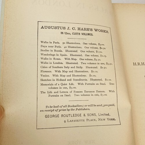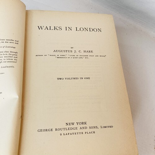 Beautiful antique 1800?s hardcover book Walks In London by Augustus J.C. Hare. Two volumes in one. Printed in USA by George Routledge And Sons. No writing, rips or tears found.