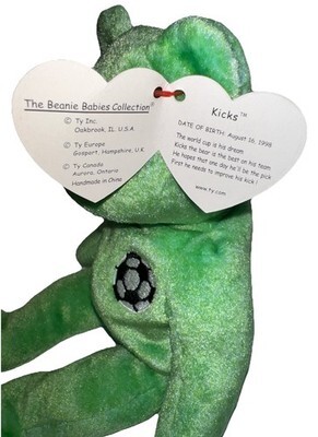 The product is a Ty Beanie Original Baby bear with the date of birth August 16, 1998. It is part of the Beanie Baby character family and is recommended for children aged 3 and up. This specific bear is known to have "KICKS" tags/error 98/99, indicating a manufacturing error. Ty Beanie Original Baby toys are collectible items that are retired and highly sought after by enthusiasts and collectors alike.