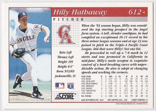 M) 1994 Score Baseball Trading Card - Hilly Hathaway #612