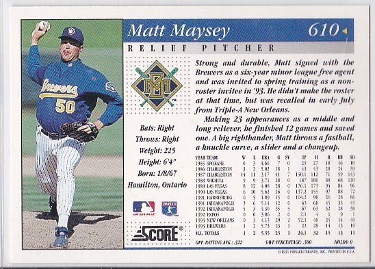 M) 1994 Score Baseball Trading Card - Matt Maysey #610