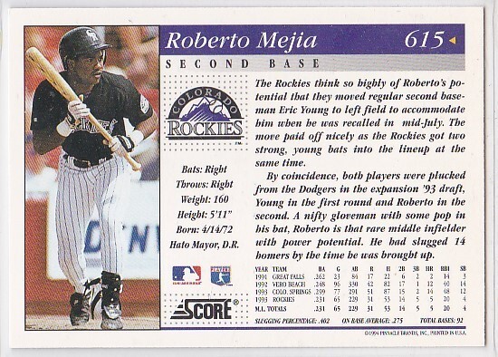M) 1994 Score Baseball Trading Card - Roberto Mejia #615