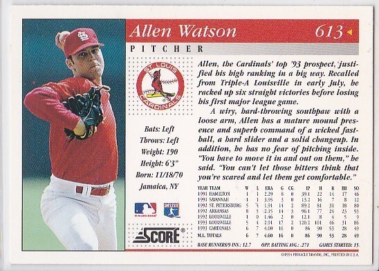 M) 1994 Score Baseball Trading Card - Allen Watson #613