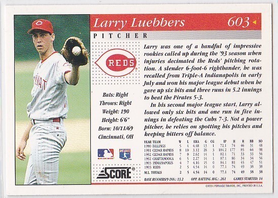 M) 1994 Score Baseball Trading Card - Larry Luebbers #603