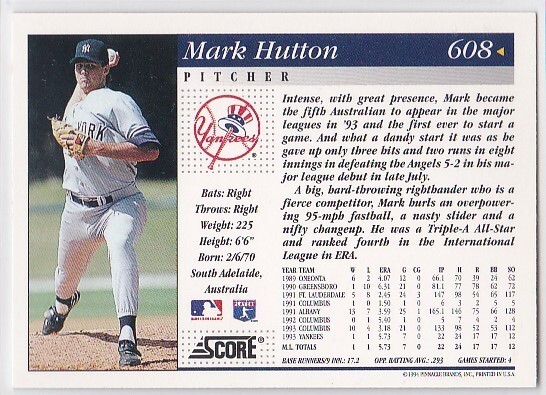 M) 1994 Score Baseball Trading Card - Mark Hutton #608