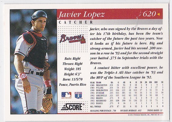 M) 1994 Score Baseball Trading Card - Javier Lopez #620