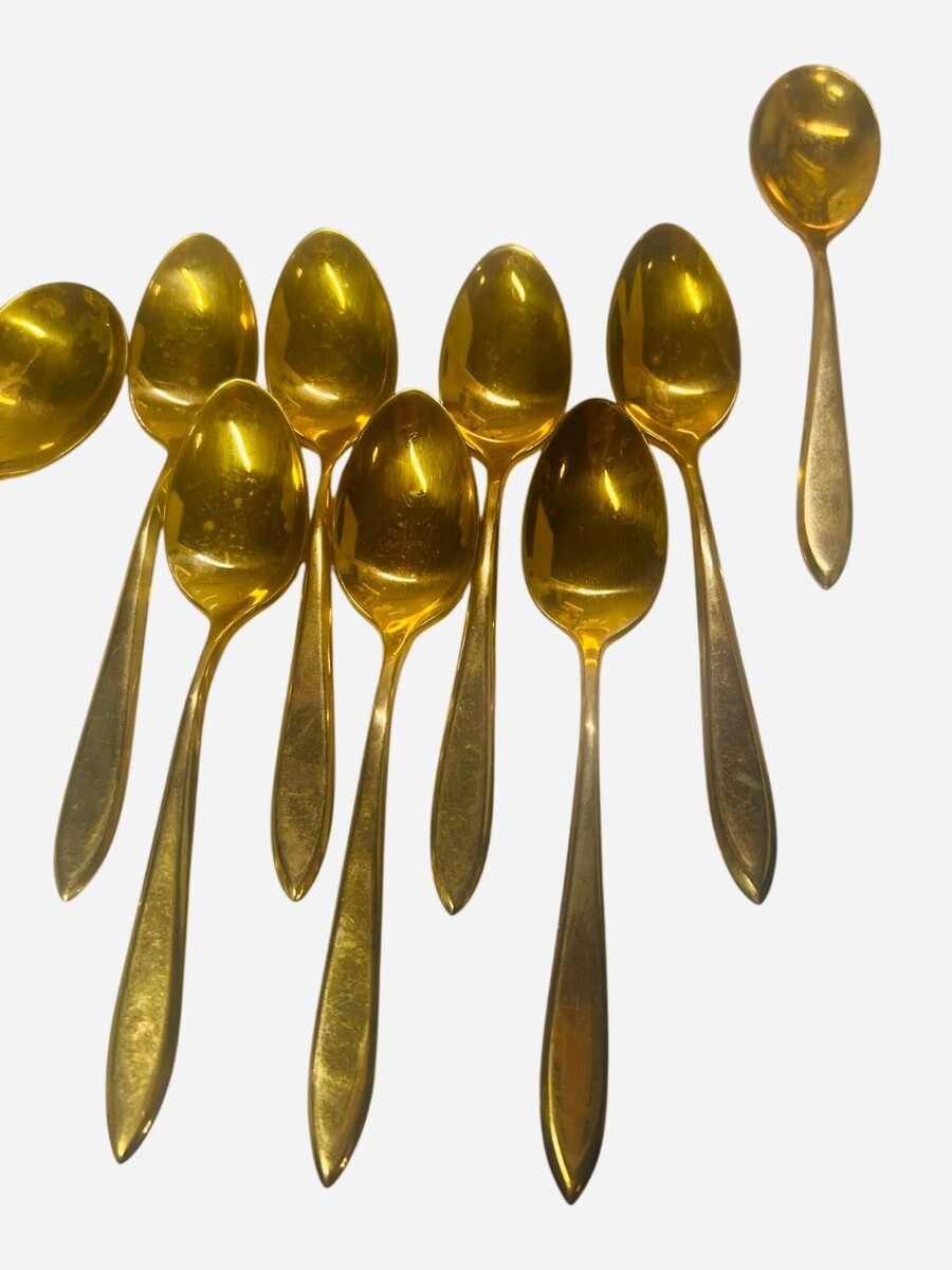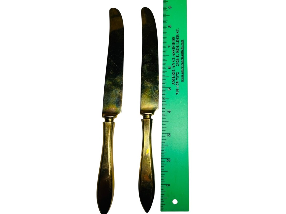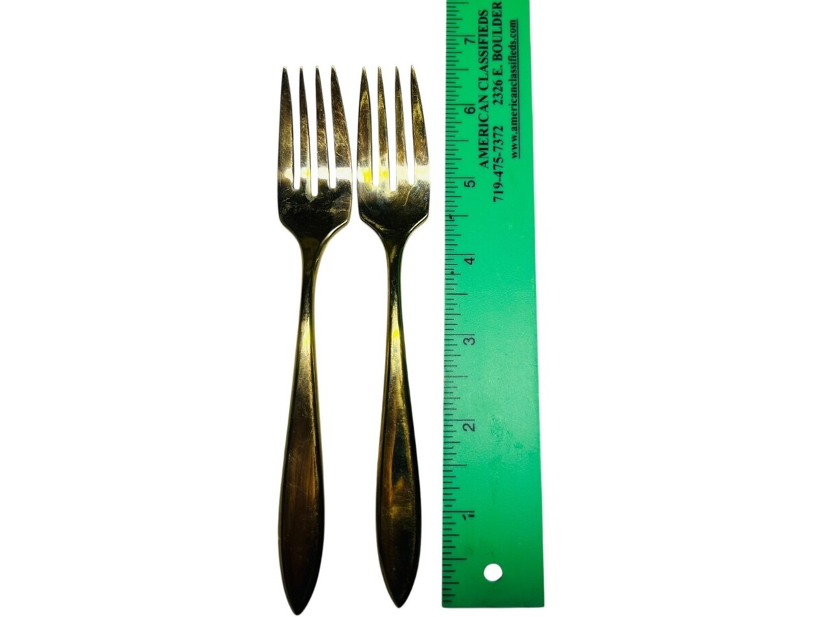Dirilyte isn?t gold?plated. It?s a solid bronze?gold alloy (copper + zinc + trace metals). Over decades, that alloy develops interference colors?the same physics behind oil?slick rainbows or old bronze statues. Purple, blue, and iridescent champagne tones appear on the flatware helping to determine its 1950s age. These colors are not tarnish in the silver sense; it?s a stable patina that many collectors actually prefer as It confirms the alloy is original and unaltered. However, there are a few scuffs and scratches and minor pinpoint imperfections that occur with the age of these utensil. Please see final photos for visual detail.
