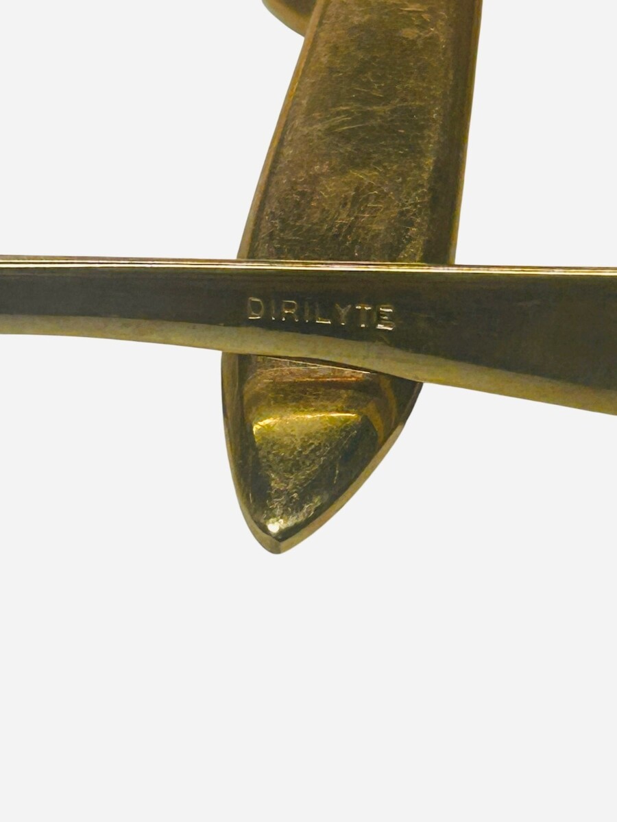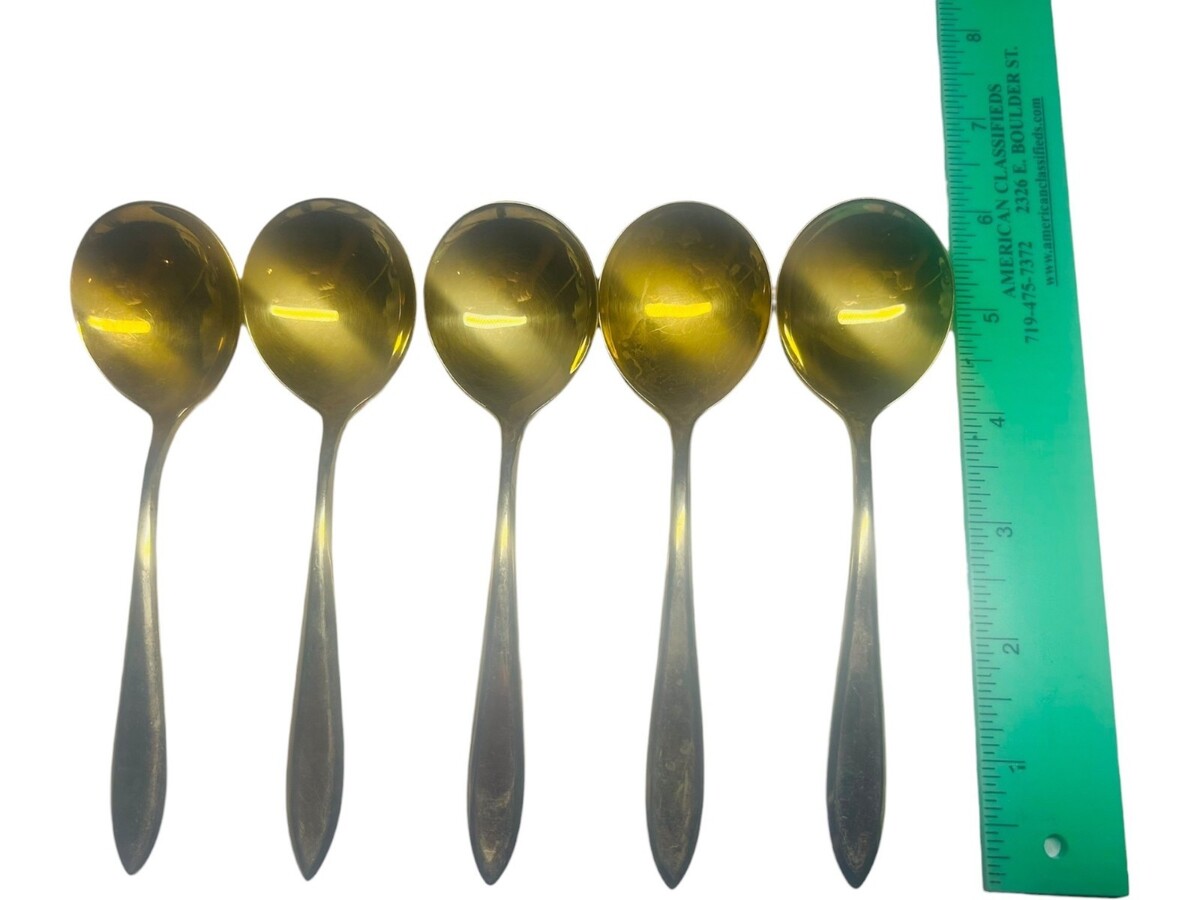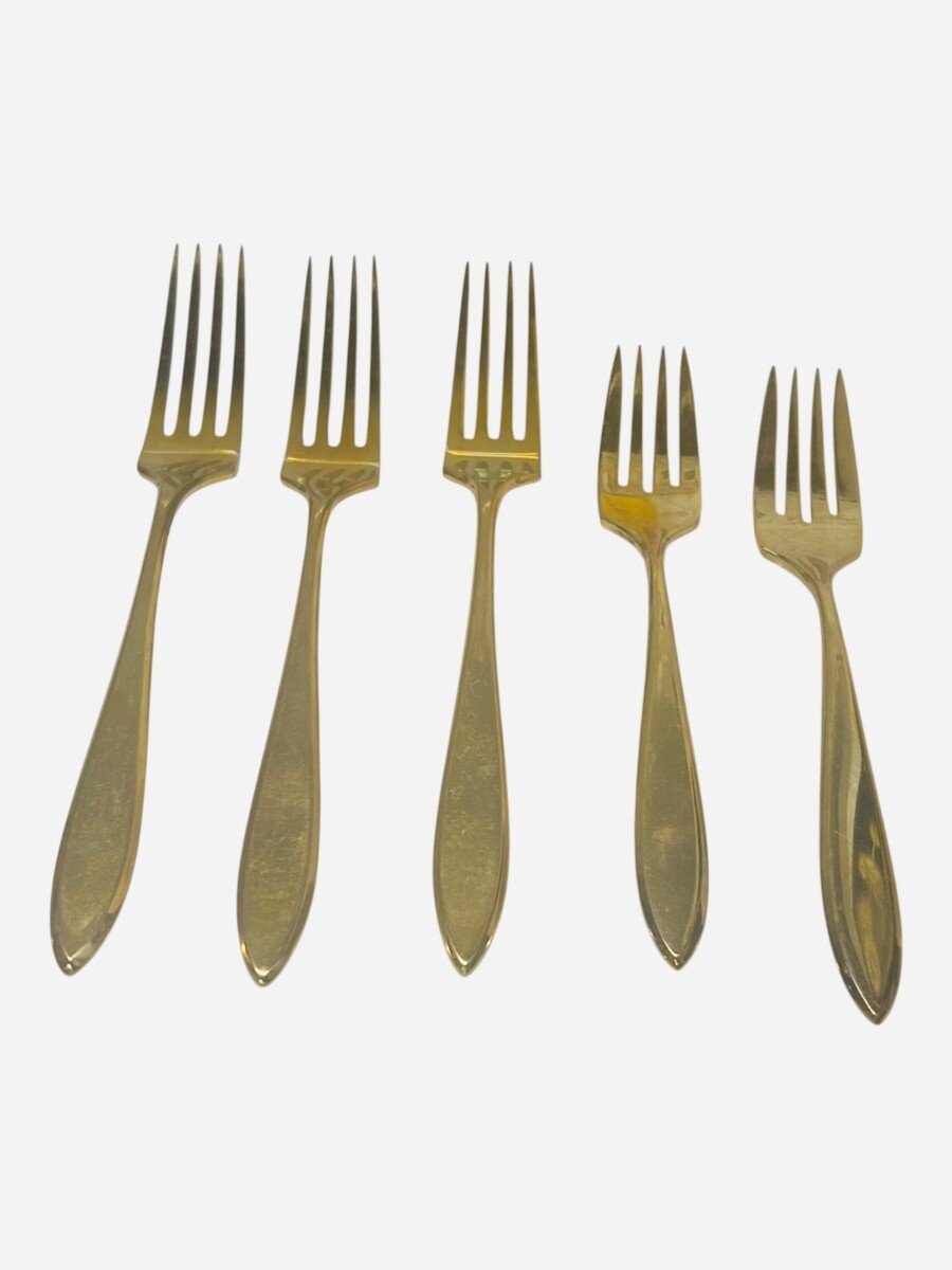 Dirilyte isn?t gold?plated. It?s a solid bronze?gold alloy (copper + zinc + trace metals). Over decades, that alloy develops interference colors?the same physics behind oil?slick rainbows or old bronze statues. Purple, blue, and iridescent champagne tones appear on the flatware helping to determine its 1950s age. These colors are not tarnish in the silver sense; it?s a stable patina that many collectors actually prefer as It confirms the alloy is original and unaltered. However, there are a few scuffs and scratches and minor pinpoint imperfections that occur with the age of these utensil. Please see final photos for visual detail.