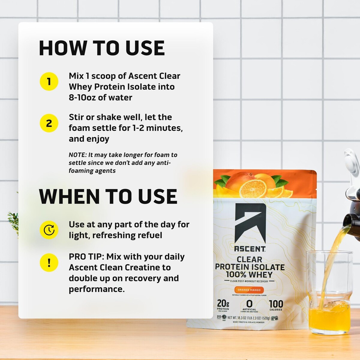 8/26 Ascent 100% Clear Whey Protein Powder Post Workout Orange Mango 20 Servings