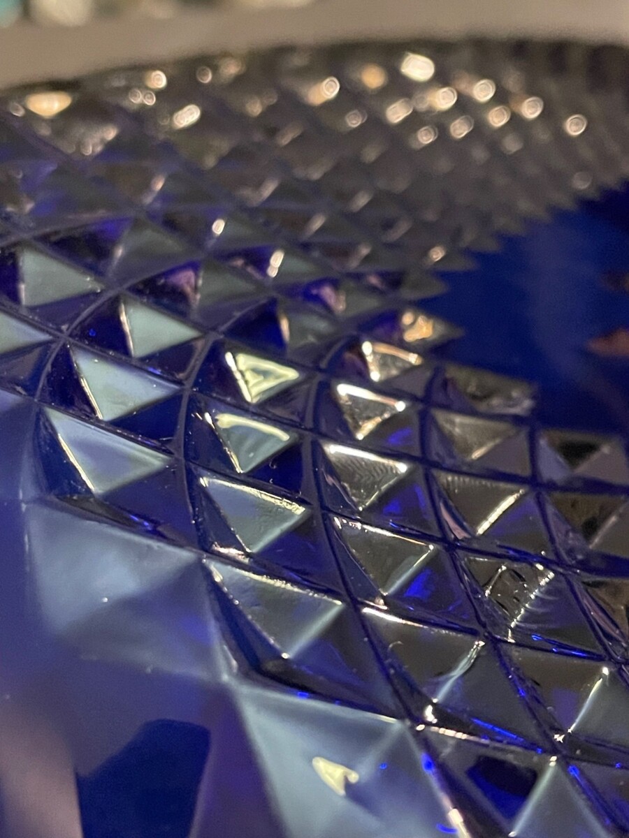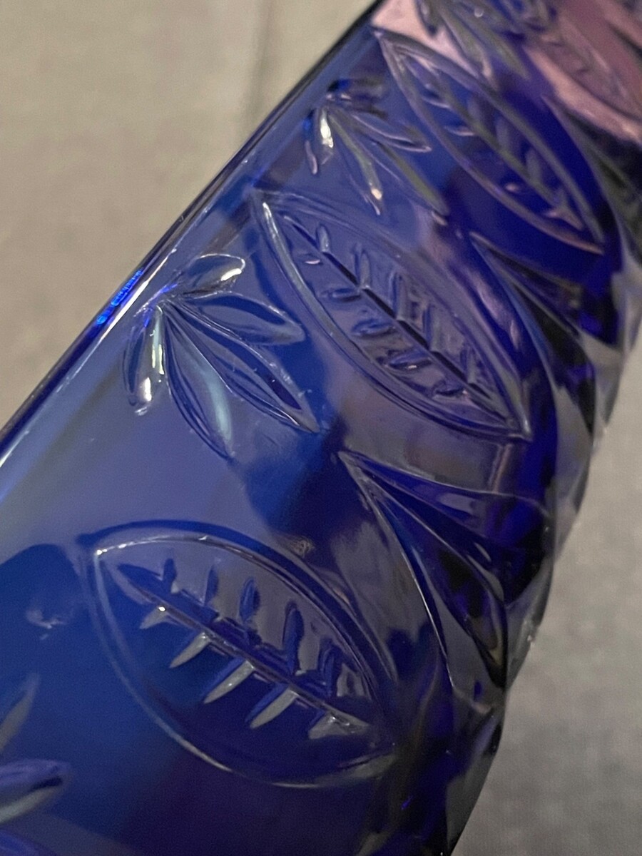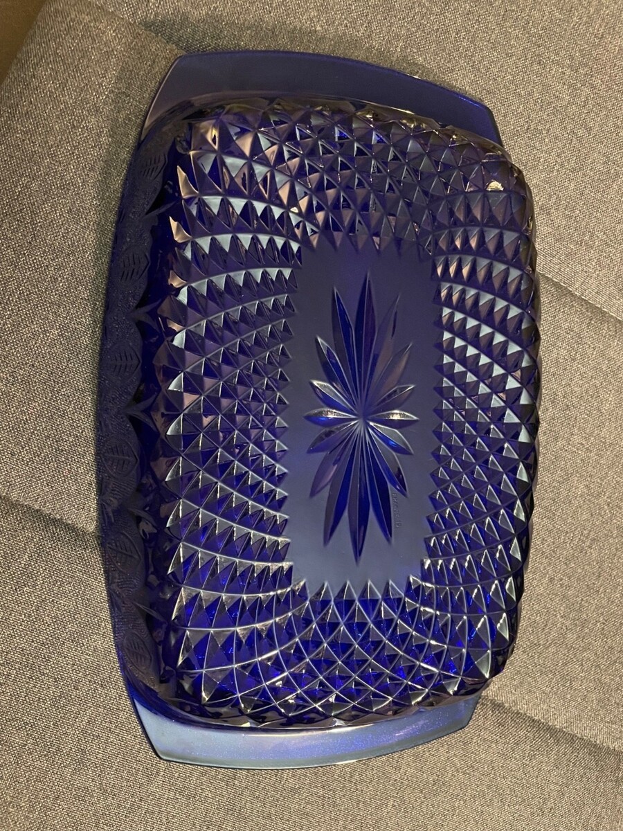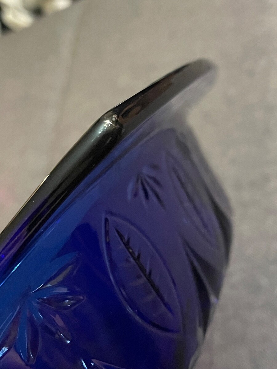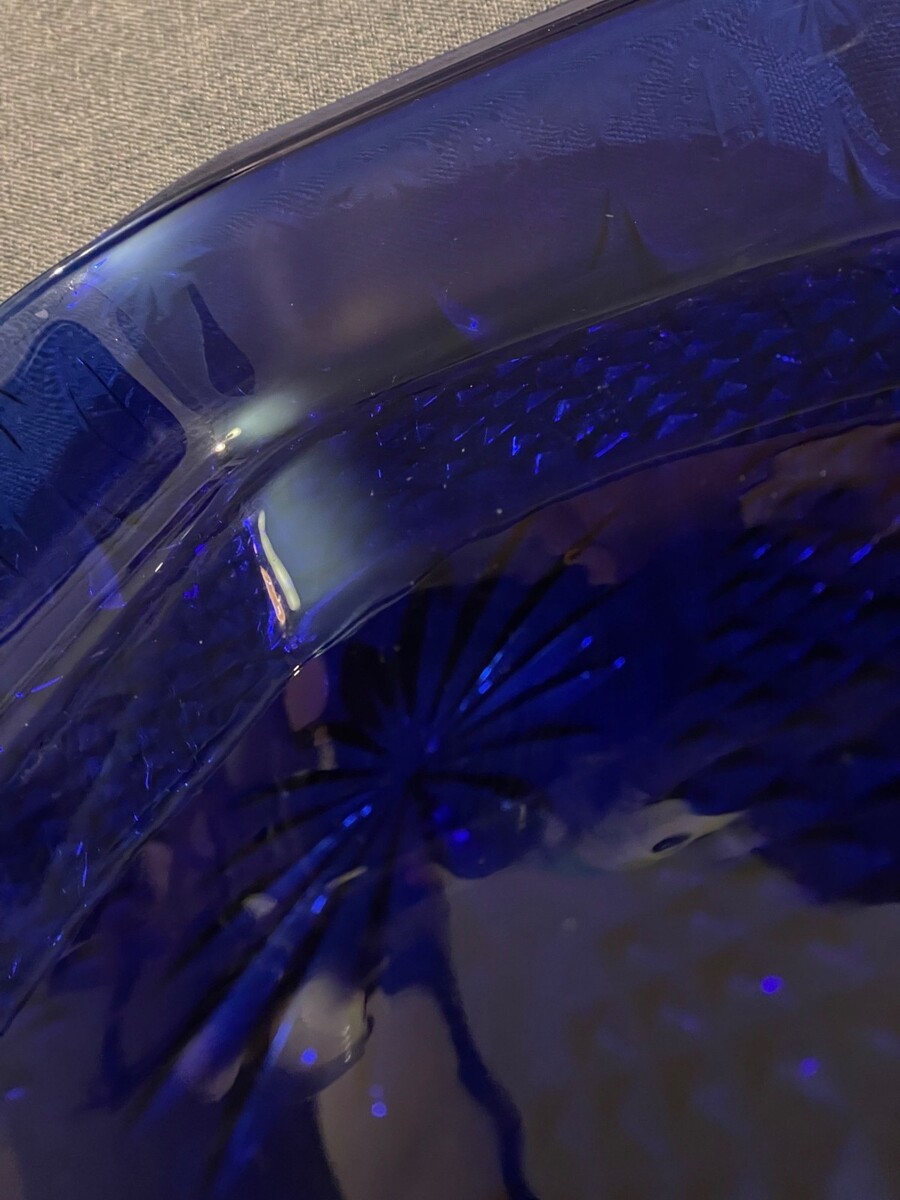 Preowned vintage condition. No cracks observed. Interior shows surface scratches from prior use. Light scuffing on exterior design edges and underside consistent with age and storage. Color remains vibrant with beautiful cobalt clarity. Please review all photos carefully for full condition details.