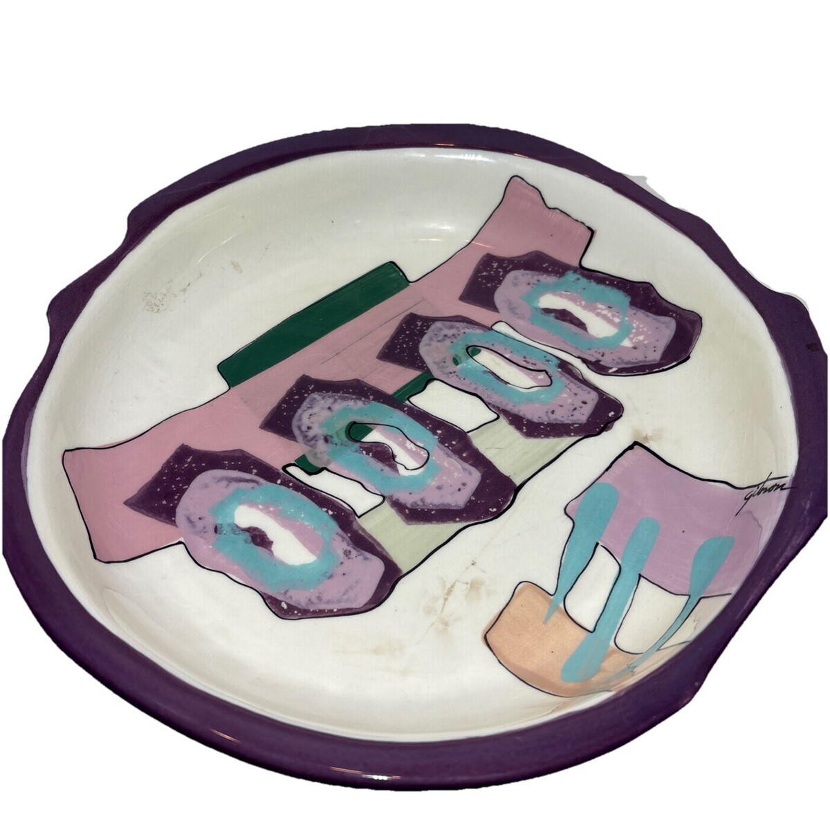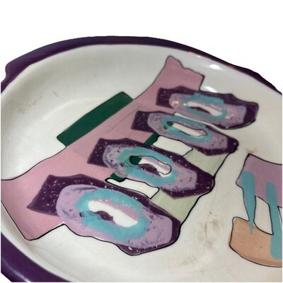 This product is a handmade large glass abstract multicolor bowl, measuring approximately 12 inches in diameter. The bowl is antique and features a round shape with a glossy finish. Hand painted and decorated, this unique piece of porcelain serveware adds a touch of artistic flair to any table setting or decorative display.