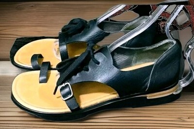 The black leather upper is complemented by straps and a toe ring, while the lace-up closure ensures a secure fit.