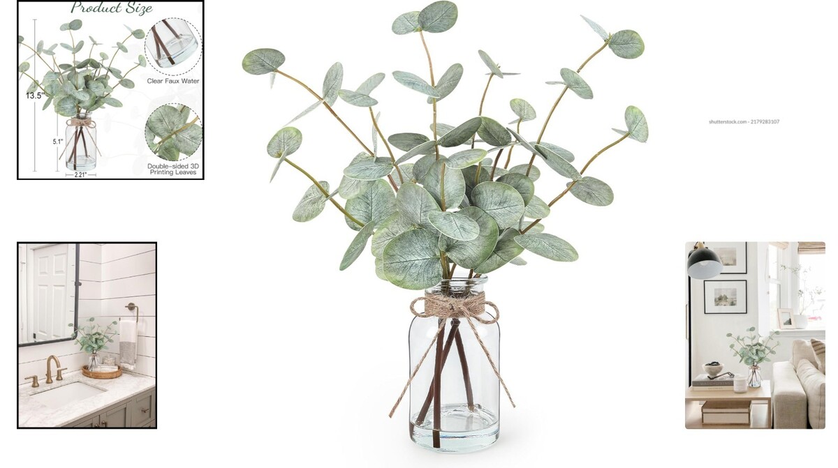 Realistic Faux Eucalyptus Plant Stems in Glass Vase - Stylish 13.5" Centerpiece