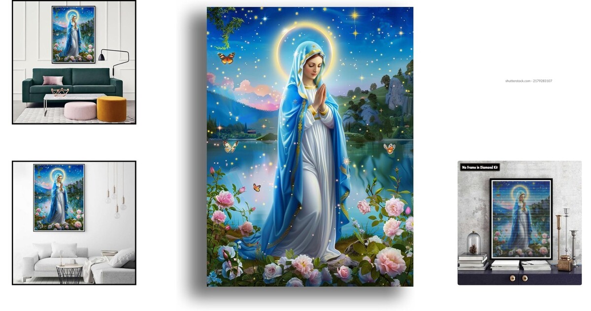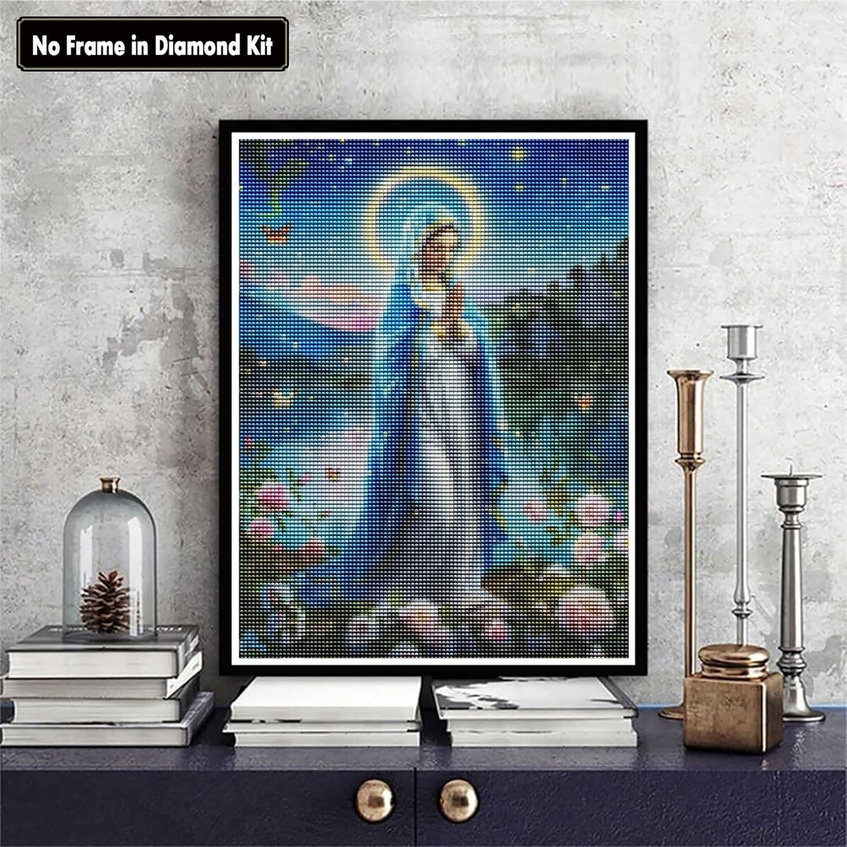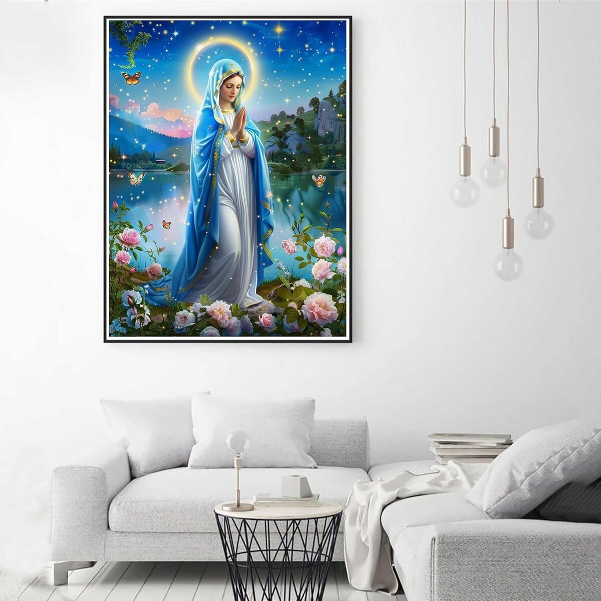 Embrace tranquility with an exquisite portrayal of the Virgin Mary, rendered in breathtaking detail. This serene figure, clad in blue, is depicted praying by a starlit lake, surrounded by delicate flowers and fluttering butterflies. Each diamond beautifully captures the essence of peace and hope, inspiring faith and a sense of calm within your creative sanctuary.