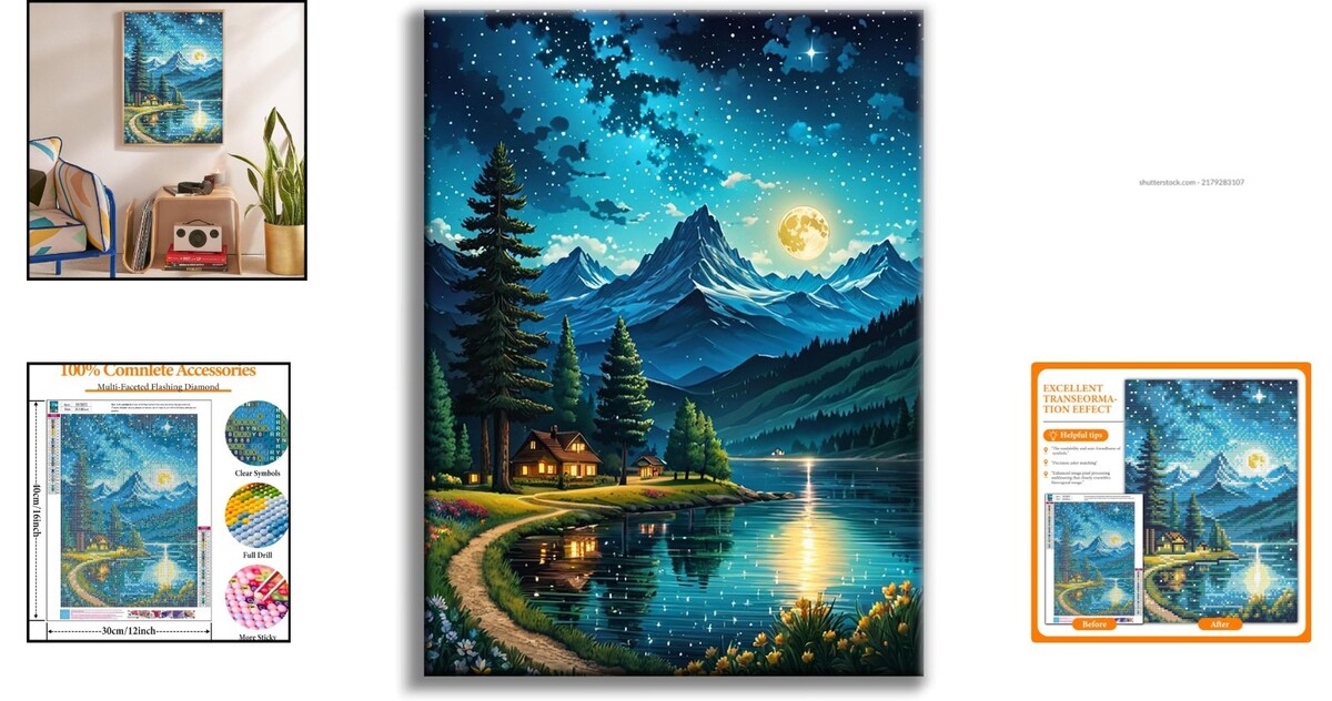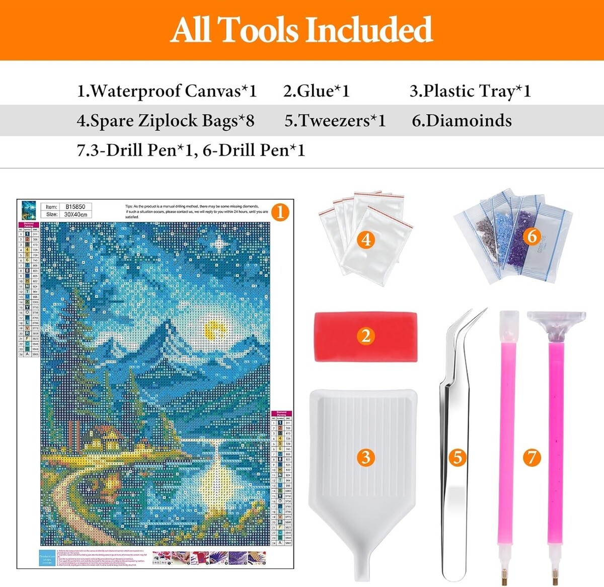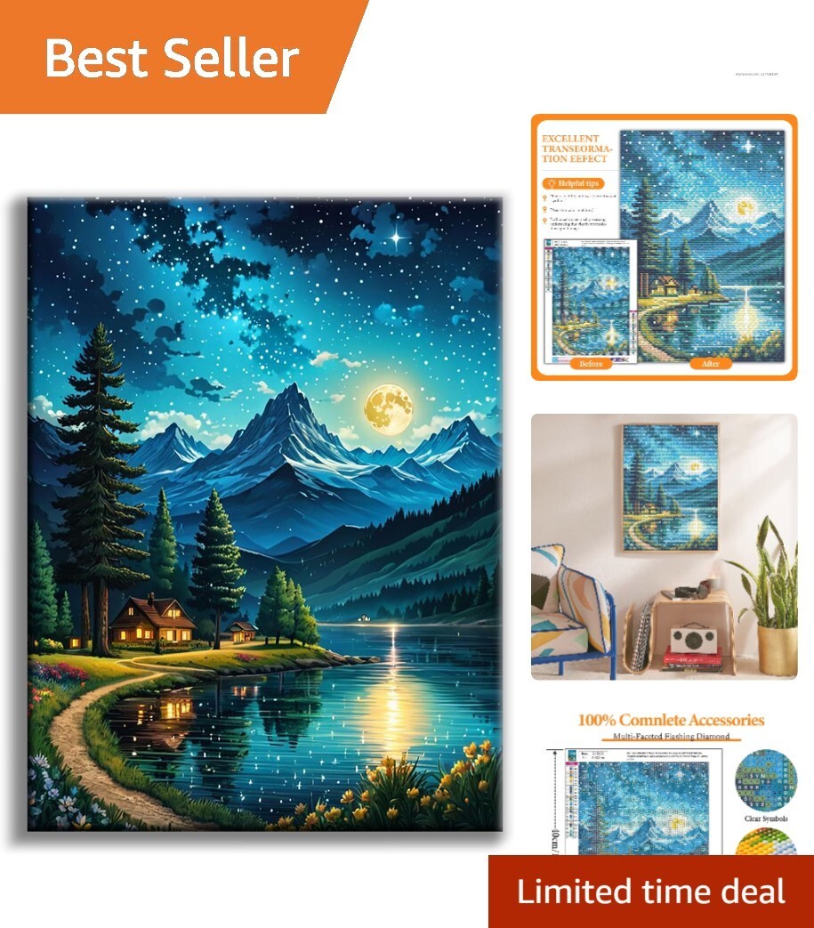 Engage in the enchanting world of diamond painting with our DIY 5D Moon Mountains Lake Diamond Art Kit. This exquisite kit features a vibrant array of colorful diamonds that transform the serene image of a moonlit landscape into a dazzling masterpiece. Watch as each sparkling diamond breathes life into the artwork, making it not only beautiful but also a collectible treasure.