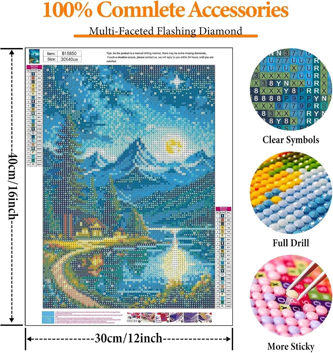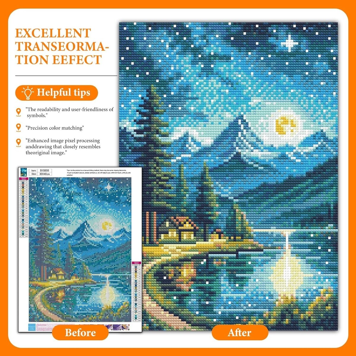 Art Deco Diamond Art Kit: Mountains Moon Lake Full Drill 12x16 for Beginners
