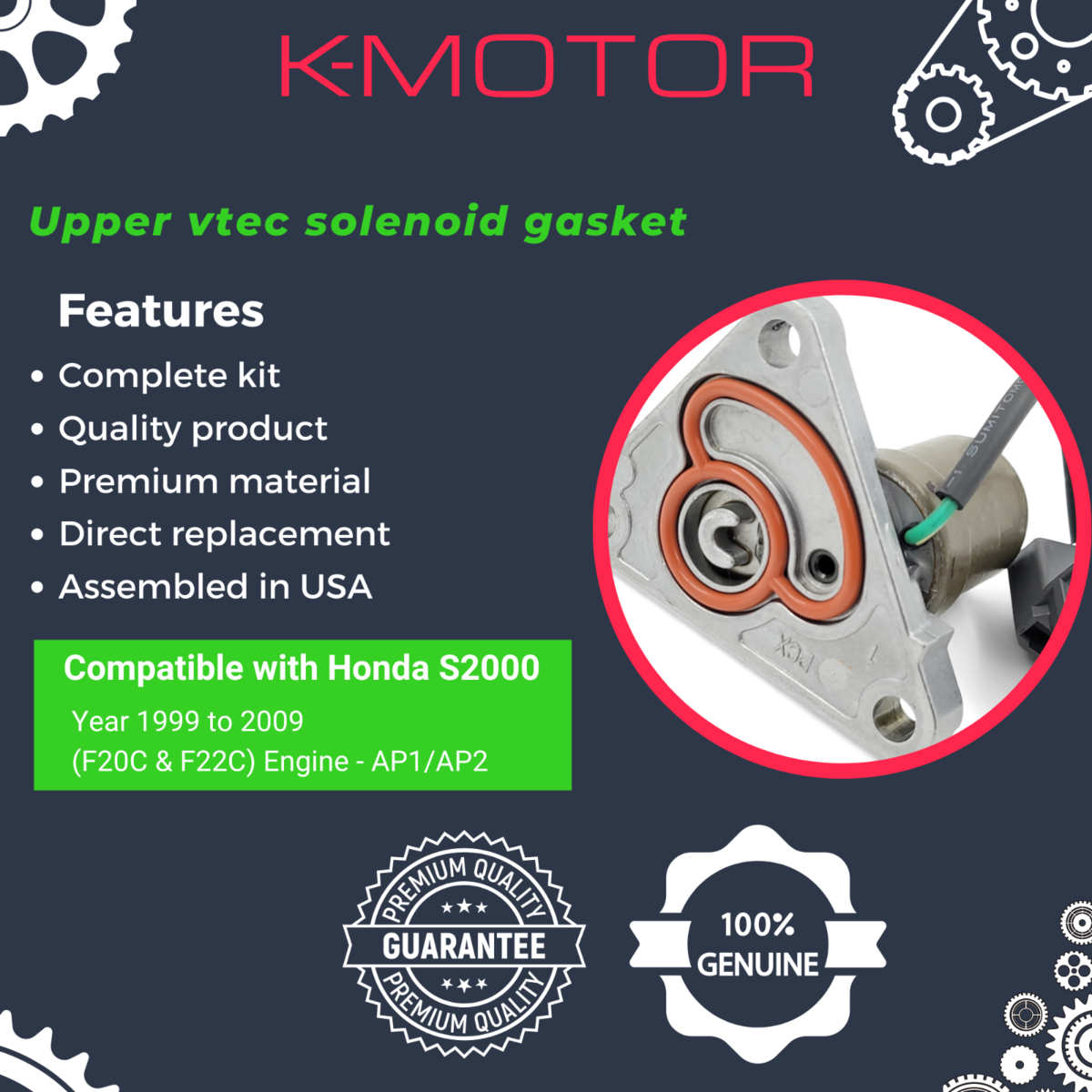 Vtec solenoid gasket kit for the Honda S2000 engine. Durable Gasket, OEM quality, made with the highest quality materials to resist oil and heat of the engine.
