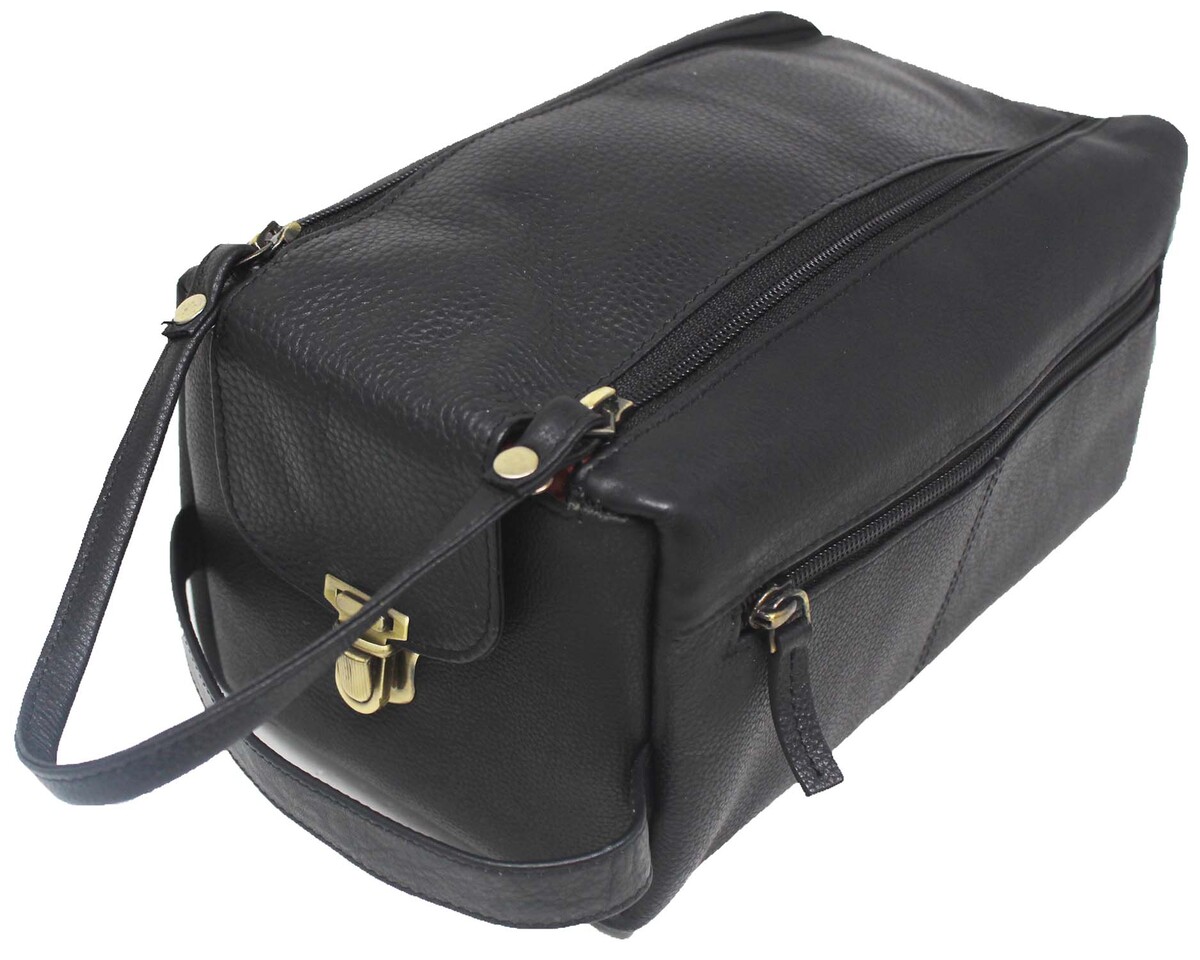 Challenger sturdy toiletry bag hand crafted from top quality black pebbled leather by artisans who have been working with leather for decades. The inside lining is water resistant for easy clean-up. The antique brass hardware gives this bag a classy look. Main compartment comes with button closure, and double zipper to ensure all belongings are secure. The interior features a side zippered pocket, and three open compartments for additional storage. On the exterior you have two side zippered pockets, one on each side. Dopp bag measures 9.5" L x 6" W x 5" H providing plenty of room to store all toiletries in one place.