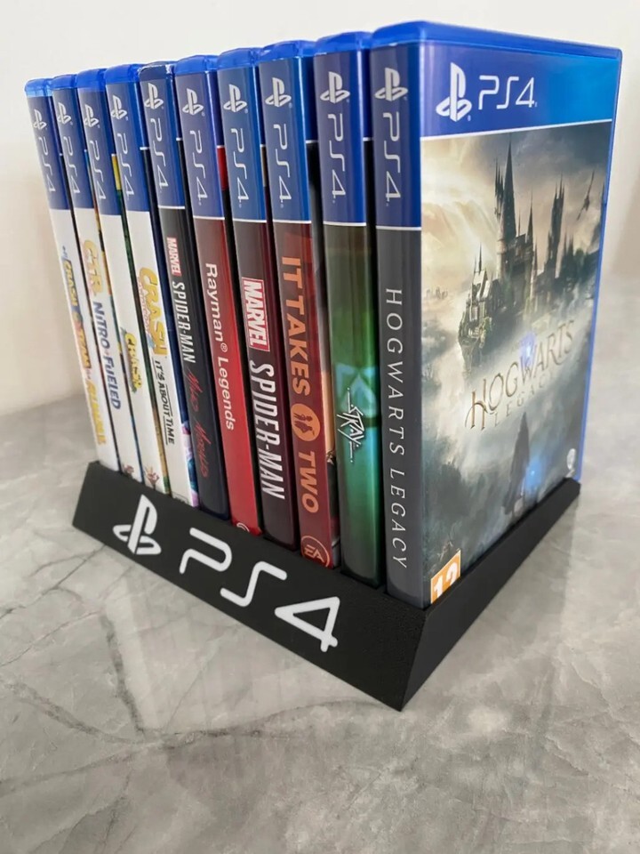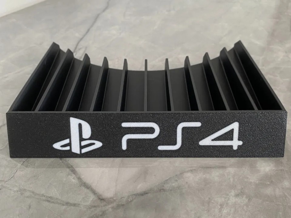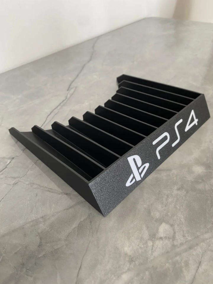 Keep your favorite PS4 games organized and easily accessible with this custom storage rack. This sturdy black stand features 10 individual slots, perfectly sized to hold standard PlayStation 4 game cases securely in place. The front of the holder is proudly emblazoned with the classic PS4 logo, making it a stylish addition to any gaming setup. Its compact, angled design saves space on your desk or shelf while neatly displaying your collection.