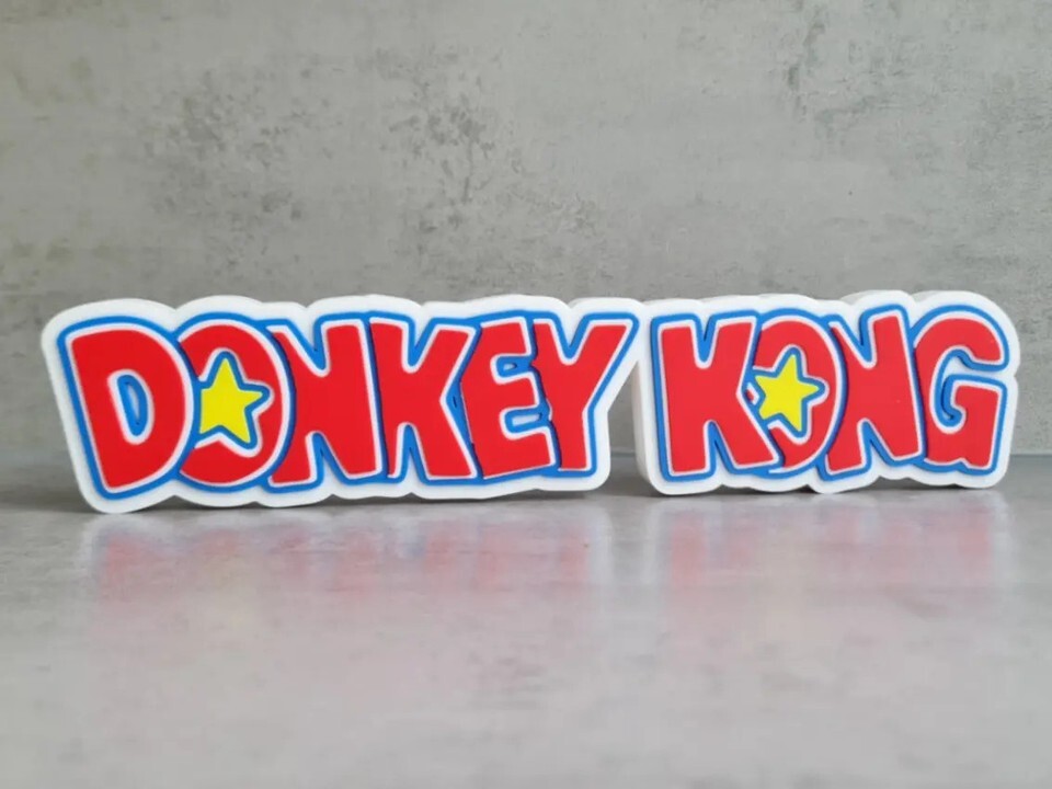 Add a touch of retro gaming flair to your space with this vibrant Donkey Kong logo sign. This freestanding display features the classic red and blue Donkey Kong title with yellow star accents, perfect for placing on any shelf, desk, or entertainment center. It's an ideal decorative piece for a game room, office, or any Nintendo fan's collection. The sign's bold colors and iconic design make it a standout piece of video game memorabilia.