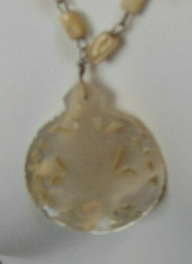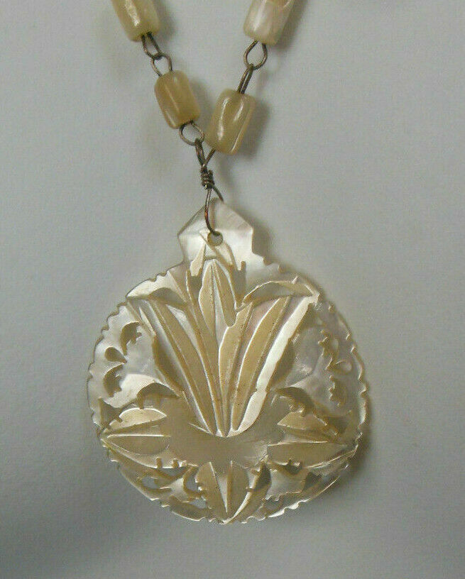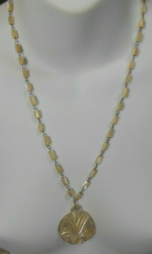 Vintage Carved Mother of Pearl Flower Pendant Bead Chain Necklace