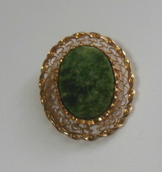 Vintage Signed de 1/20 14K Gold Filled Filigree Green Agate Brooch/Pendant
