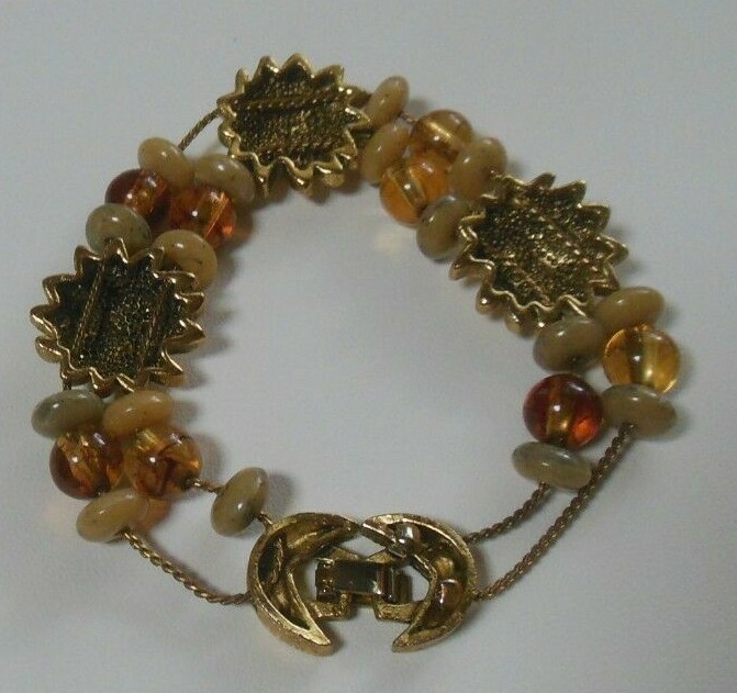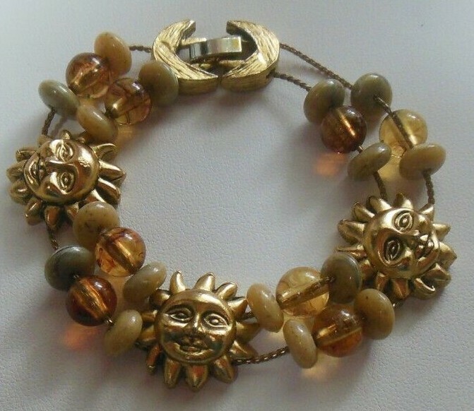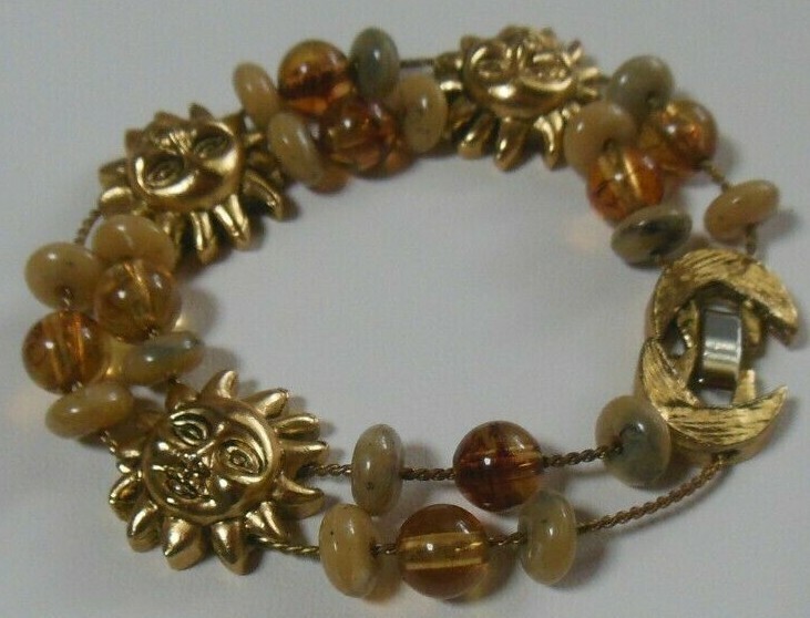 Vintage Gold-tone Happy Sun Face Glass Bead Slider Bracelet 7.25" Long