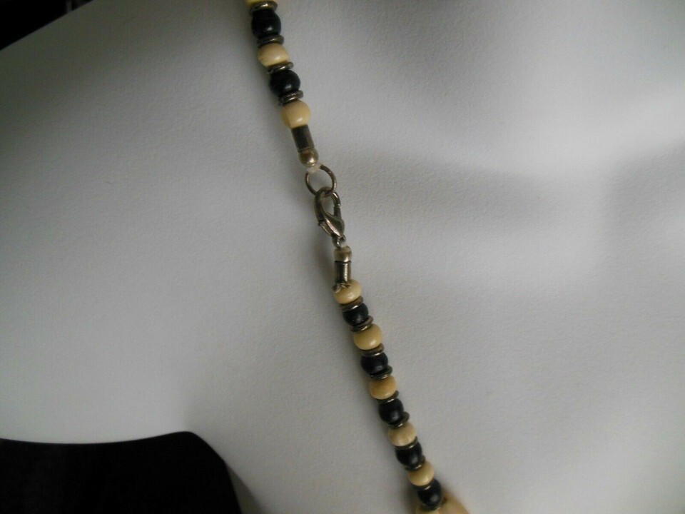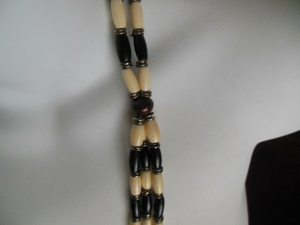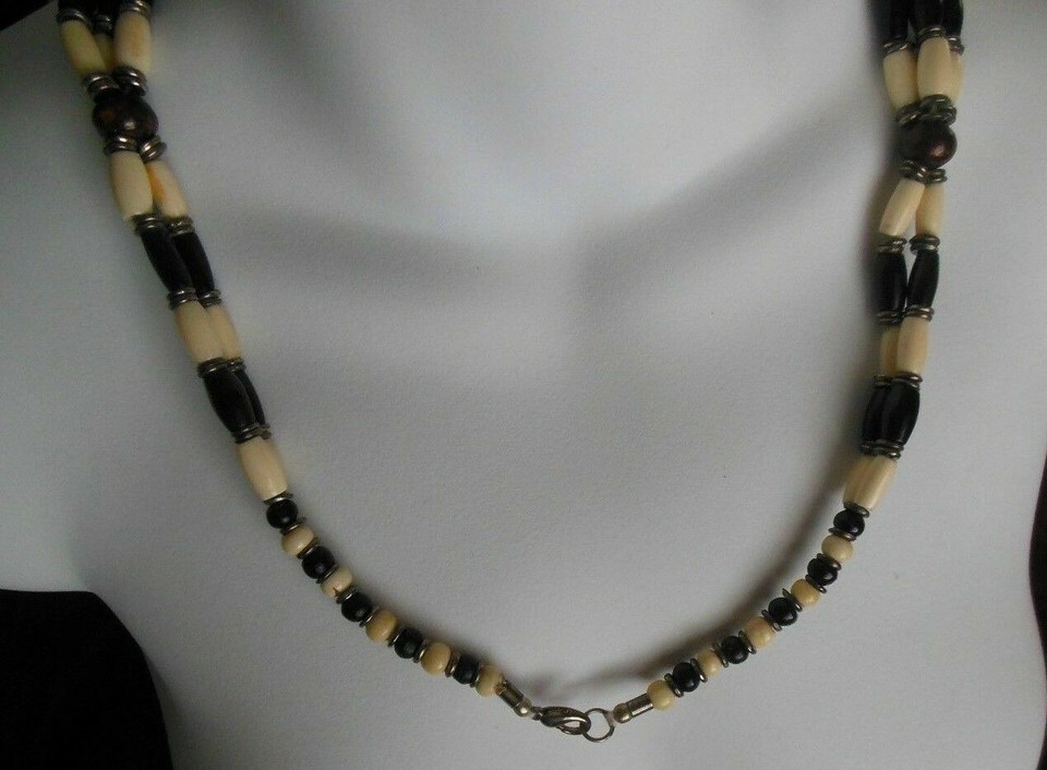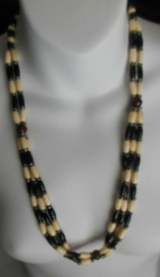 Heavy Black & Off White beaded Strand Necklace W/ Silver Tone/Wood Spacers