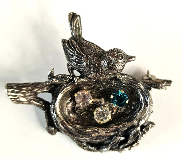 The Vintage Signed Anson Sterling Bird on Nest Brooch features a beautiful design of a bird perched on a nest, with three tiny rhinestone eggs- blue, clear and light pinkish color.