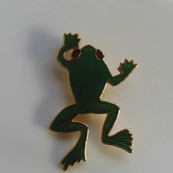 Fish & Crown Mark Green Enamel Frog Brooch W/Red enamel Eyes