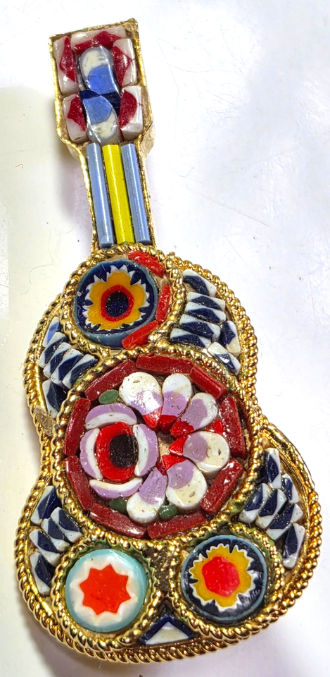 Vintage Gold-tone Multi-color Mosaic Guitar Brooch