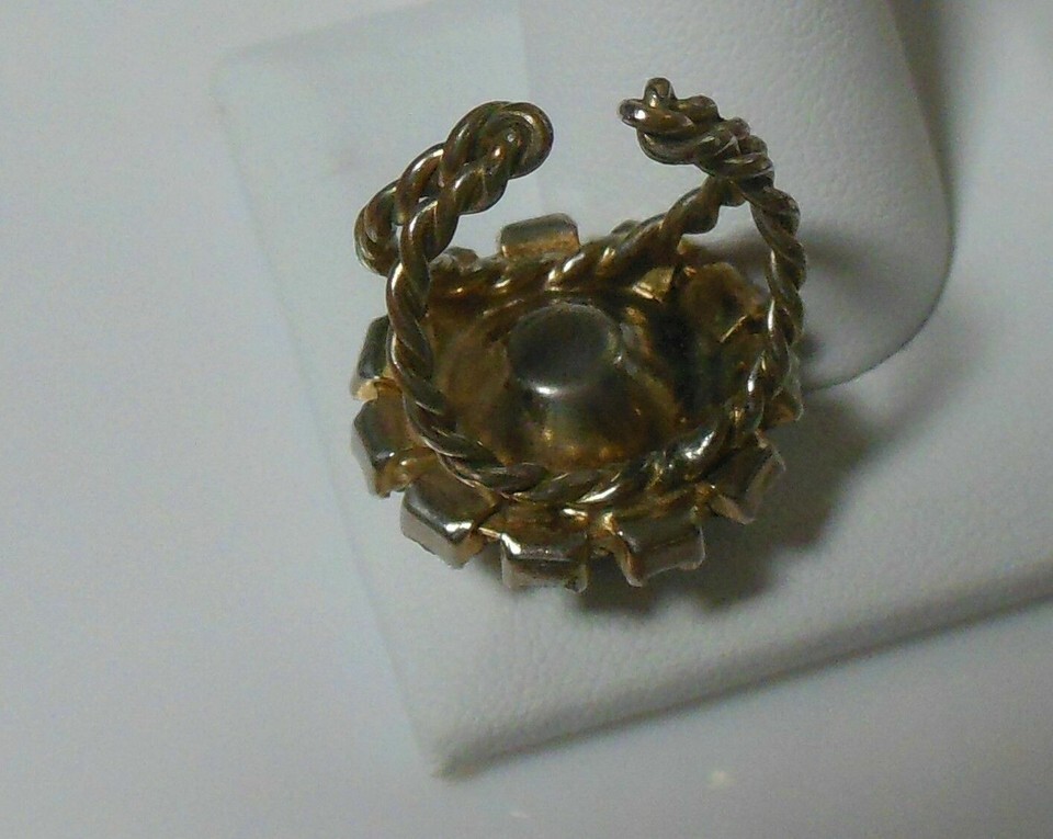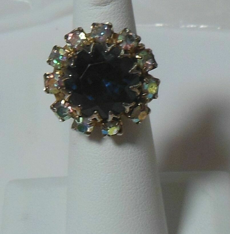 Antique Gold-tone Large Blue Faceted Stone & Rhinestone Adjustable ring