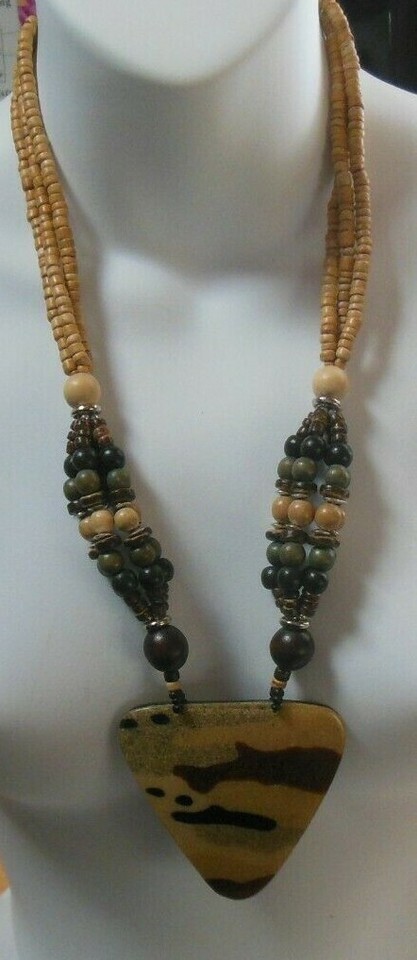 Vintage Triple Strand Camouflage Bead Pendant Statement Necklace