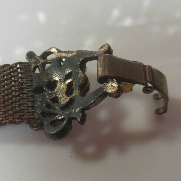 Good condition for its age. Looks really old. The end where the clasp meets was repaired and the bar is crooked (See pic 5) but clasp still works well.