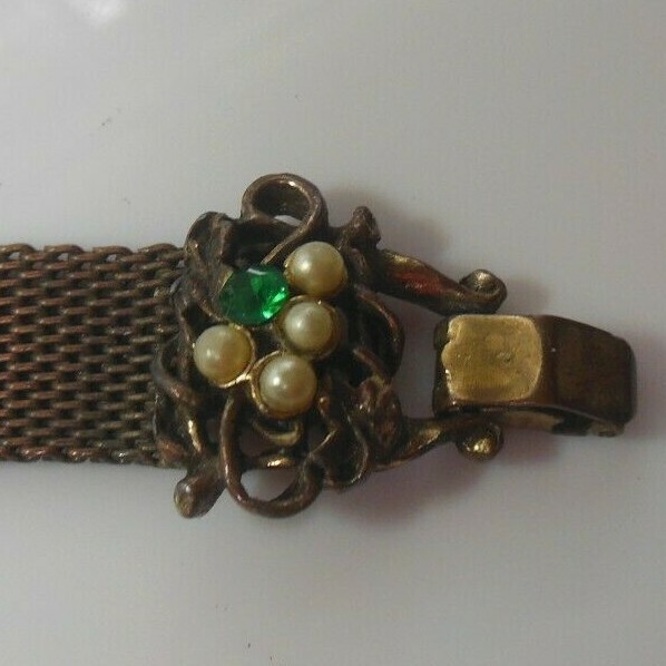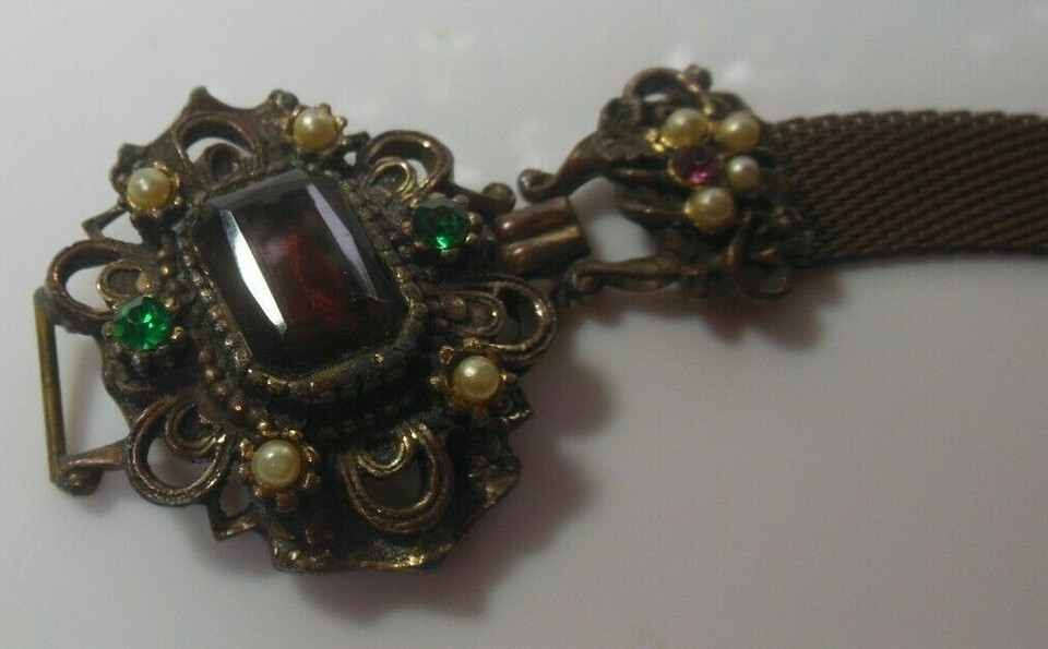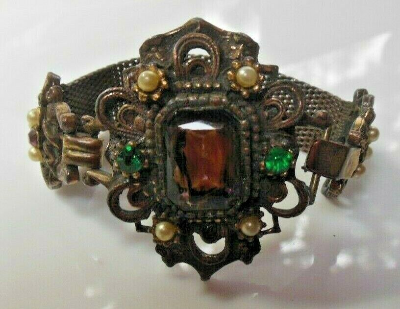 Antique Victorian Mesh Gold-tone Amethyst, Green Rhinestone Faux Pearl Bracelet