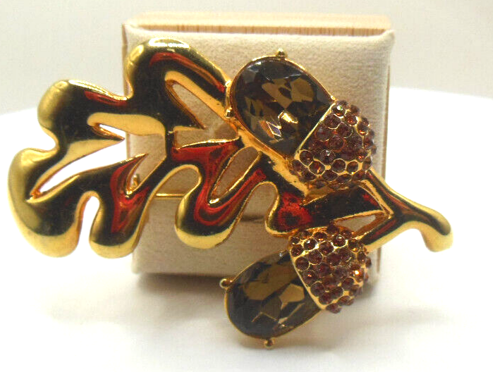 Vintage Designer Acorn Brooch Pave Rhinestone Brown Faceted Glass