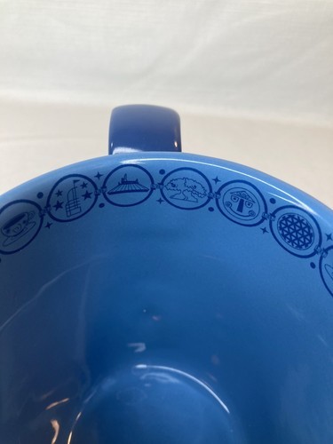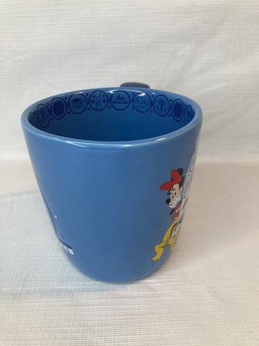 Big and heavy, this Walt Disney World blue coffee mug is a show stopper with its unique handle and great details! Beautiful colors and your favorite classic Disney Characters from the 2018 ?The Year To Be Here? slogan in the front, the Walt Disney World logo on the back, and cute little designs all the way around the inside rim. Great collectors piece or gift for that Disney fan!