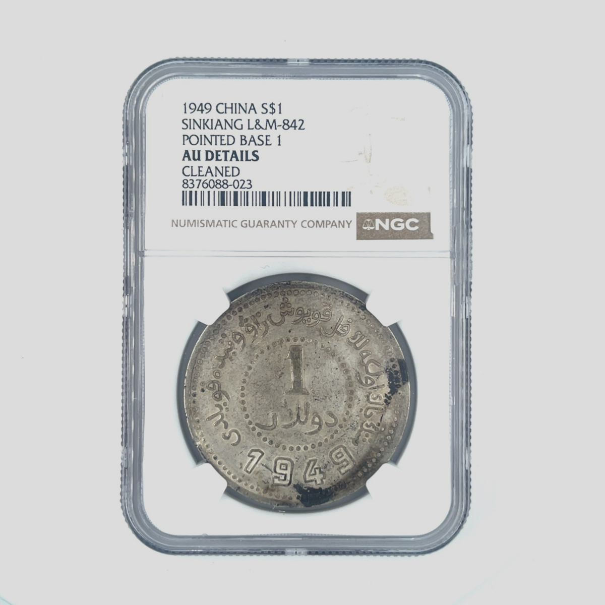 1949 China S$1 Dollar Sinkiang L M-842 Pointed Base 1 by NGC as AU DETAILS!