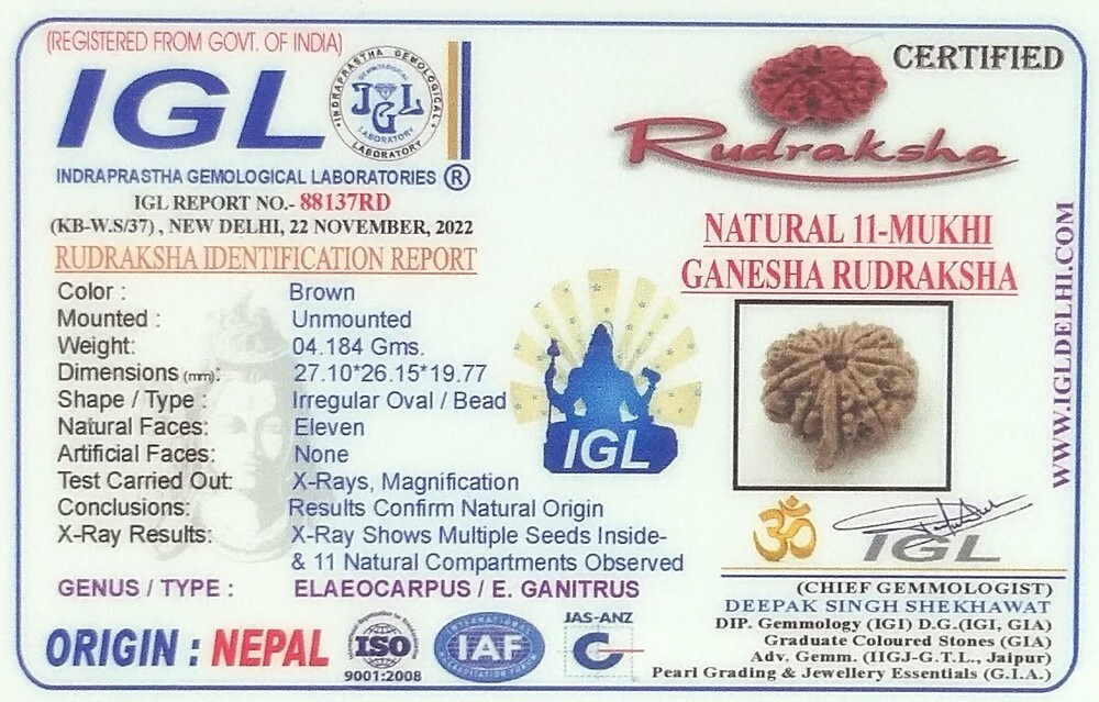 Rare 11 Mukhi Ganesha Rudraksha - Collector - 27.10 mm - Nepal - IGL Certified