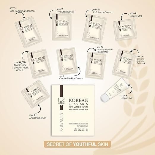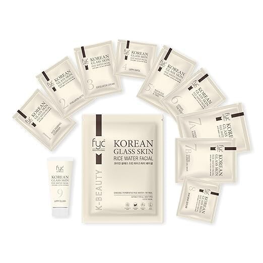 9-Step Korean Facial Ritual for Glass Skin: Experience salon-like results at home with the FYC Professional Korean Glass Skin Rice Water Facial Kit. A complete 9-step skincare routine inspired by K-Beauty rituals that deeply cleanses, nourishes, and rejuvenates your skin for a radiant glass-like glow.