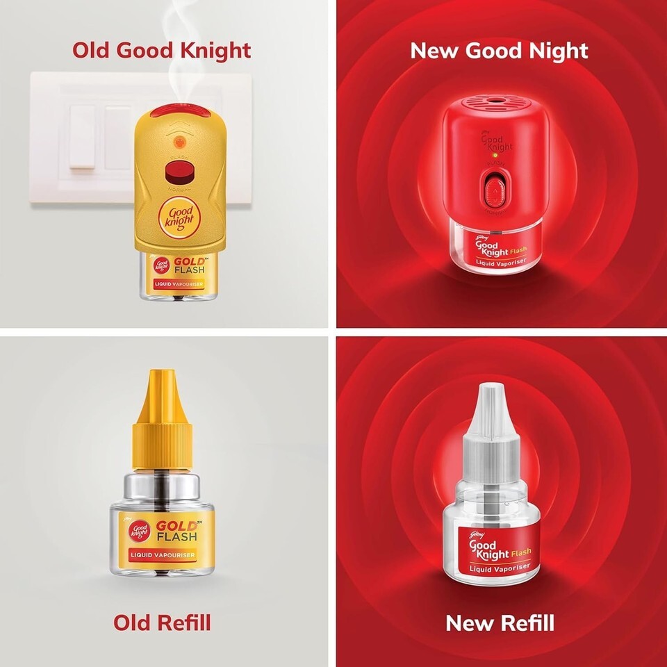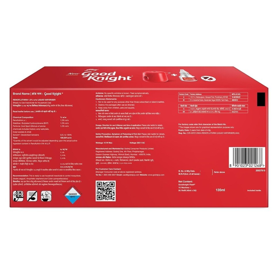 CONTAINS: 1 unit of electric plug-in Good knight Flash machine and 3 refills of anti-mosquito liquid vapouriser (45ml each)