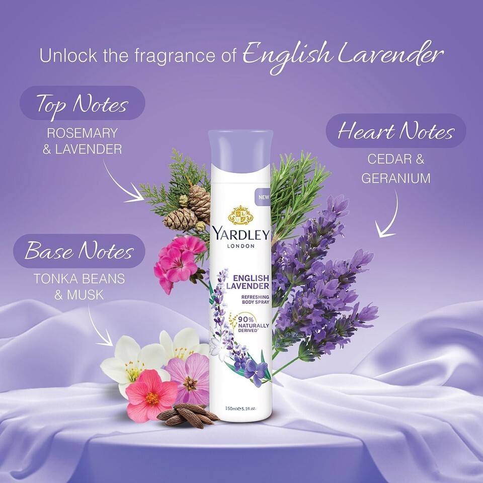 The Essence of Calm: Yardley London English Lavender, an iconic refreshing spray crafted since 1770 with pure natural lavender oils and musk notes for a pleasant smell that lingers all day
