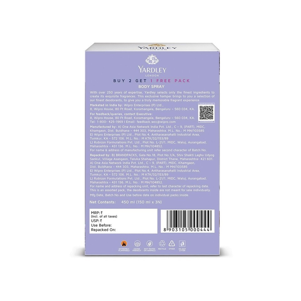 Embark on a sensory journey with the Yardley London Deodorant Body Spray Assorted Pack, a curated collection of timeless elegance and English beauty. Indulge in the delicate allure of English roses, Raspberry, and Sandalwood with the English Rose variant, perfect for any occasion. Capture the essence of calm and sophistication with the English Lavender, blending floral freshness and musk undertones. For a burst of morning freshness, the Morning Dew variant combines Freesia, Rose, Lily of the Valley, and Musk, setting a cheerful tone for your day. Each spray is a harmonious fusion of luxury, quality, and natural beauty, reflecting Yardley's legacy of over 250 years. Elevate your senses and embrace sophistication with the Yardley London Deodorant Body Spray Assorted Pack.