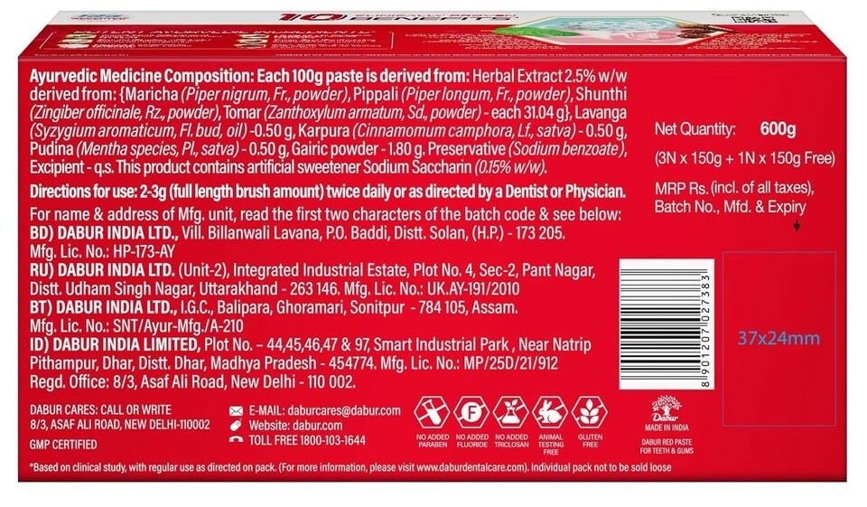 MADE WITH 13 POTENT AYURVEDIC INGREDIENTS: Dabur Red toothpaste is crafted from 13 potent Ayurvedic ingredients, including Pudina Satva (peppermint) that provides fresh breath, Laung ka Tail (Syzygium aromaticum) that relieves toothache, Shunthi (Zingiber officinale) that has anti-inflammatory and antibacterial properties, and Tomar Beej (Zanthoxylum armatum) that has antiseptic and antibacterial properties.