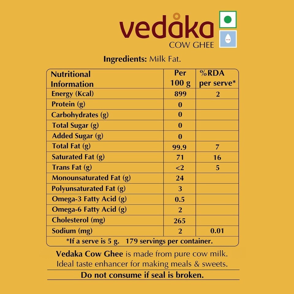 Vedaka cow ghee contains Vitamins A and E and healthy short chain fatty acids, providing you with important