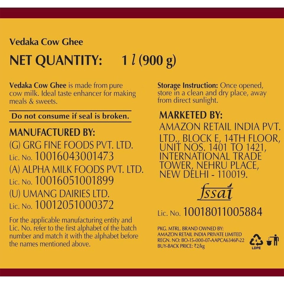 Vedaka cow ghee meets food safety standards and is hygienically packed. Bring out the taste of your food with this aromatic cow ghee.