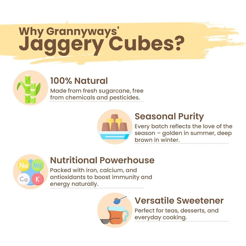 ? {MADE FROM 100% NATURAL SUGARCANE JUICE} ? Grannyways Jaggery Cubes are prepared using time-tested traditional methods, where fresh sugarcane juice is slowly boiled to preserve its natural richness. These golden cubes are free from artificial sweeteners and chemical processing, making them a pure and authentic choice for daily sweetening needs.