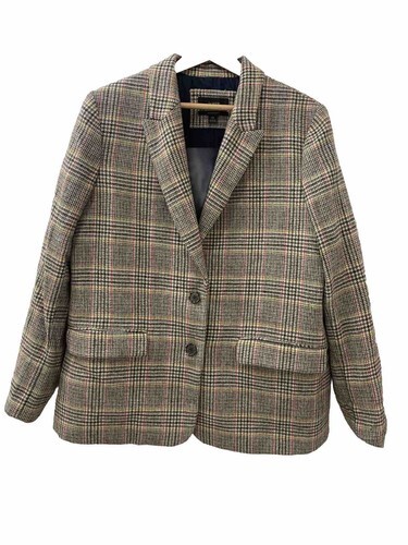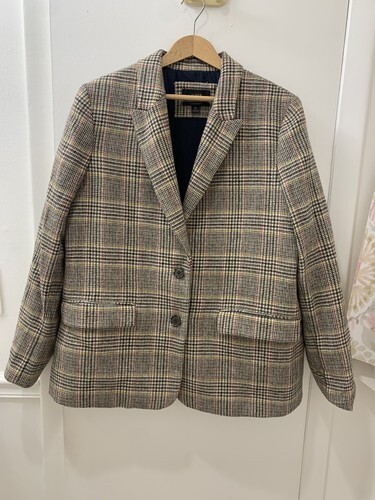 The J Crew Sommerset Glen Plaid English Moon Wool Blazer in Plus Size 16 is a stylish and versatile piece perfect for workwear or business occasions. Made from high-quality wool with a tweed fabric type, this mid-length blazer features a classic plaid pattern in a sophisticated Glen Plaid color. With long sleeves, a button closure, and accents of buttons and pockets, this blazer exudes a preppy and polished look. The J.CREW brand ensures attention to detail and quality craftsmanship, making it a timeless wardrobe staple for the modern woman. Preloved in excellent condition.