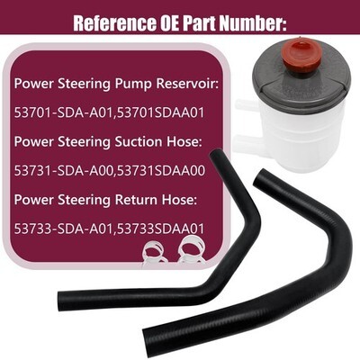 Replace Part Number: Power Steering Pump Reservoir: 53701-SDA-A01, 53701SDAA01, Power Steering Suction Hose: 53731-SDA-A00, 53731SDAA00, Power Steering Return Hose: 53733-SDA-A01, 53733SDAA01