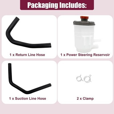 Package Include: 1 x Power Steering Reservoir, 1 x Power Steering Return Hose, 1 x Power Steering Reservoir Suction Line Hose, 2 x Clamp. Please carefully check the part number and fitment before purchase