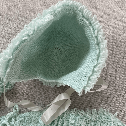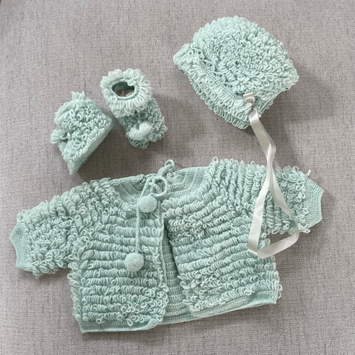 New Vintage 60s Seafoam Green Newborn Baby Bonnet Booties Cardigan Gender Neutra
